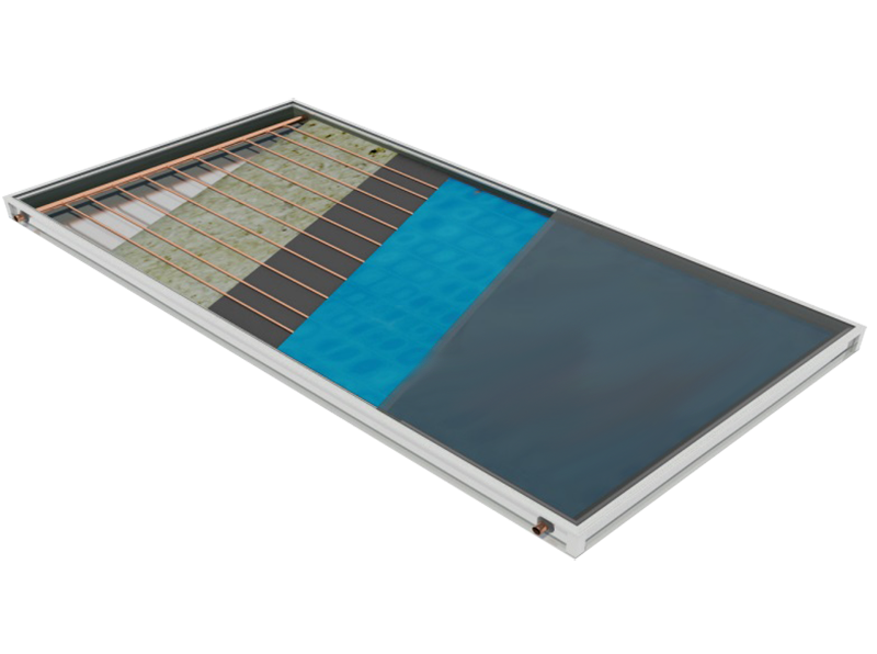 When exposed to sunlight, a special solar coating on the collector panel transfers heat to a pipe matrix containing transfer fluid (water and glycol). As it heats up, the density of the transfer fluid decreases causing the hot fluid to rise up the matrix to a manifold at the top of the collector.